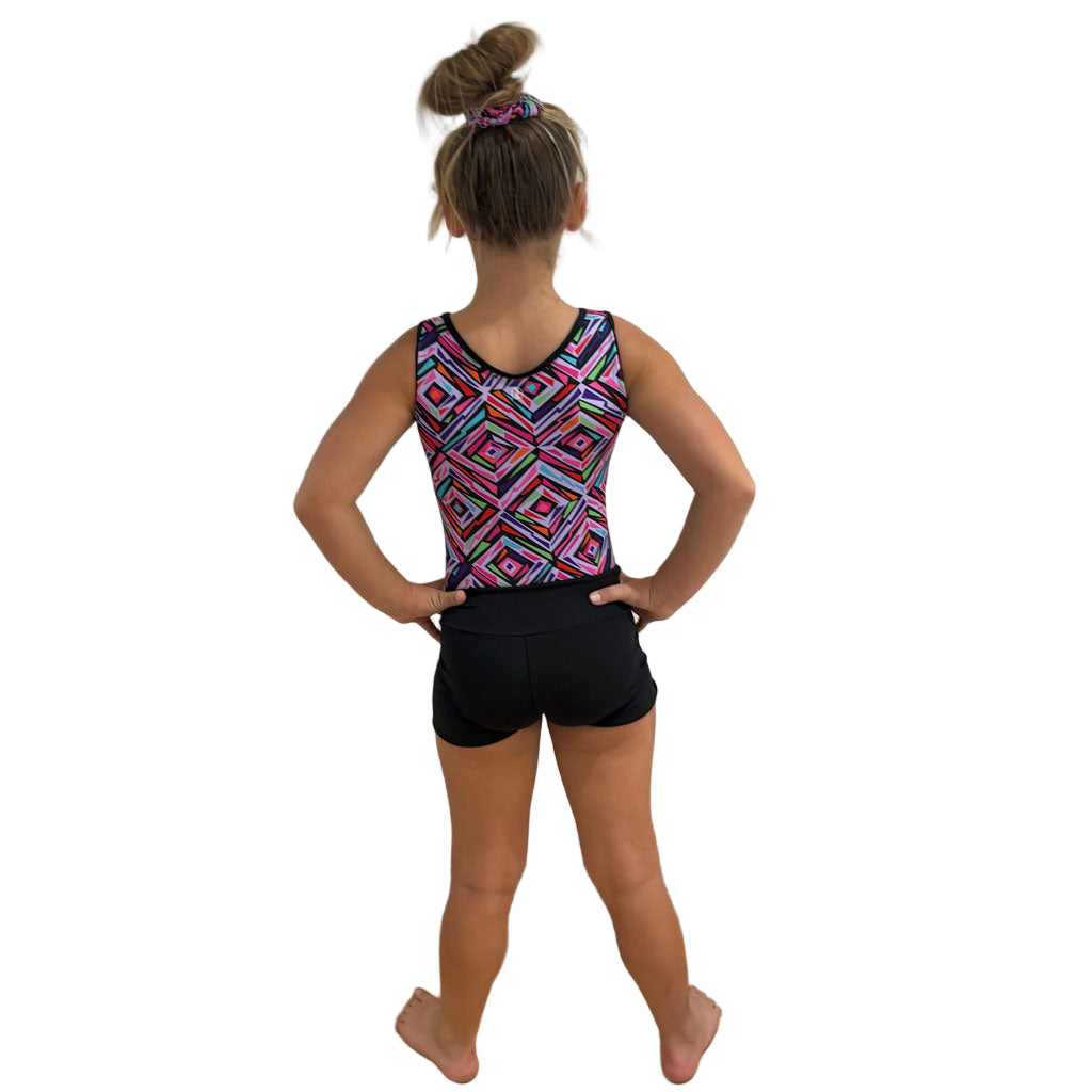 Girls Printed Pink Aztec Stretch Sleeveless Leotard with Black Shorts