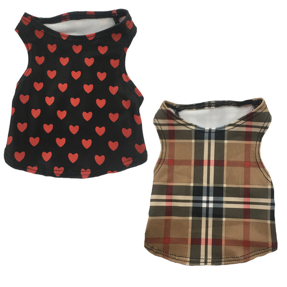 Set of 2 Small Breed Dog Tank-tan plaid/hearts